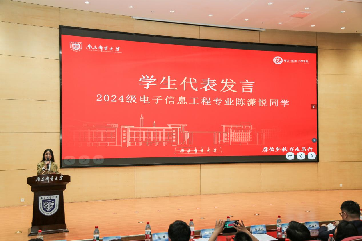 在大会的上篇“师道传薪,致敬师贤 —— 本科生导师制聘任仪式” 环节,通信与信息工程学院党委副书记、院长邹玉龙宣读导师制聘任决定,为学院本科生培养注入新的师资力量。导师代表胡海峰教授发言时表示,导师将充分发挥自身专业优势,在学业指导、科研引导、职业规划等方面为学生给予全方位支持,帮助学生成长为社会需要的栋梁之材。2024级电子信息工程专业陈潇悦作为学生代表发言,表达了对学业的期待,以及努力学习、不负期望的决心。这一环节彰显了学院对人才培养的重视,而校企合作也将为这一培养模式注入更多产业资源与实践经验。