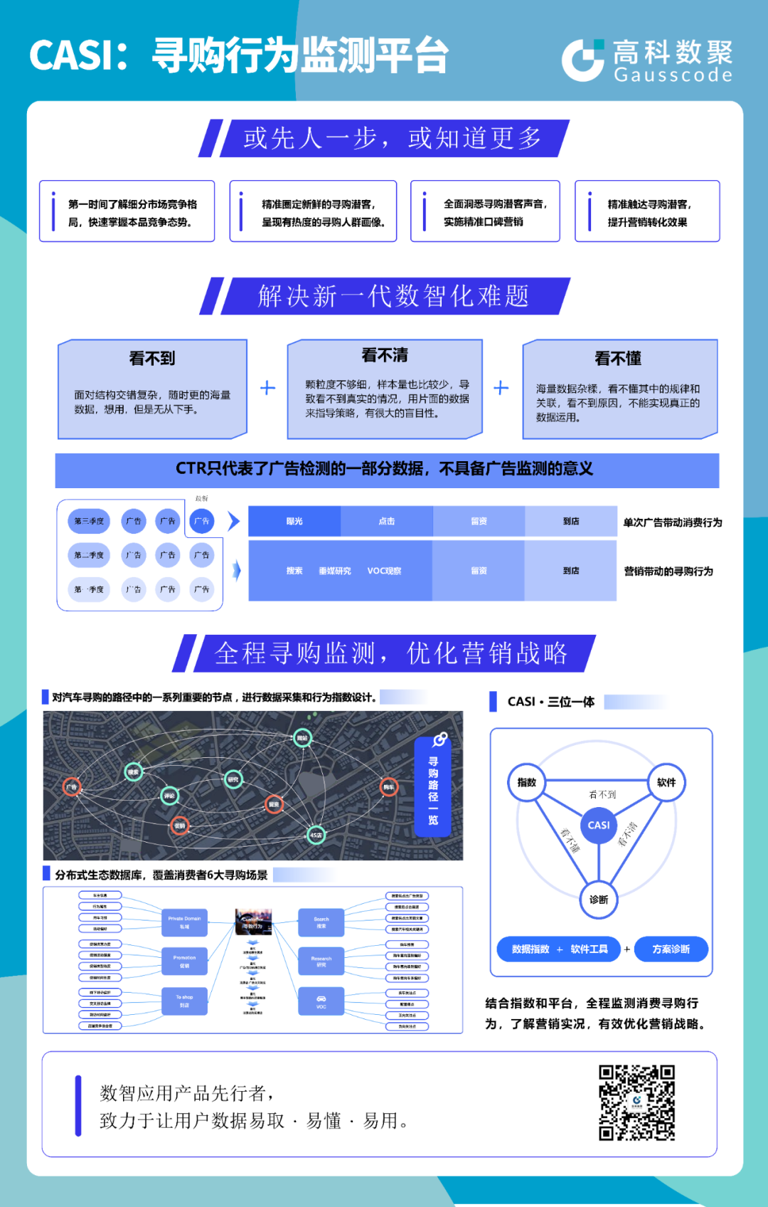消费者寻购行为监测指数平台CASI ,将消费者在寻车、比车、研究、到店、试驾、促销等一系列洞察消费者行为的重要场景和节点进行数据分析指数化,加以高级分析模型及算法,灵活组合各项行为指标,科学、客观的反应综合营销效应,不再依赖单一指标评估营销动作。